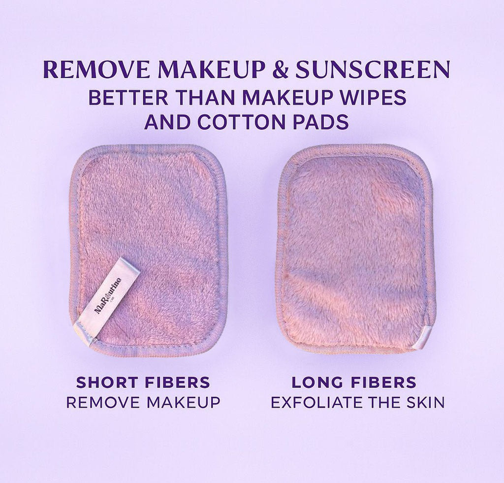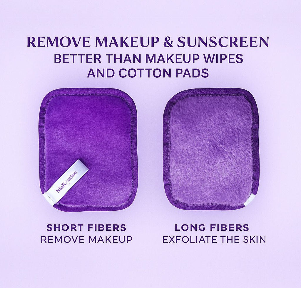 The short fiber side removes makeup, while the long fiber side gently exfoliates, enhancing the absorption of skincare products.